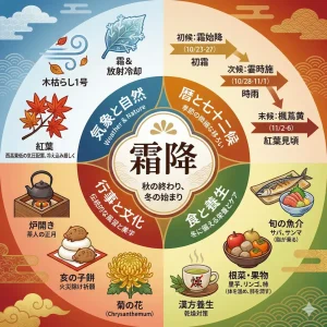 10月23日頃は、二十四節気の「霜降(そうこう)」にあたります🍂。文字通り、北国から霜が降り始める頃とされ、秋が深まり冬の訪れが近いことを告げる季節の節目です。
