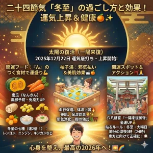 しかし、この日を境に再び昼が長くなっていくことから、「一陽来復(いちようらいふく)」とも呼ばれます。これは、悪いことが続いた後で幸運に向かうという意味を持ち、冬至は「再生」や「好転」の象徴とされてきました。