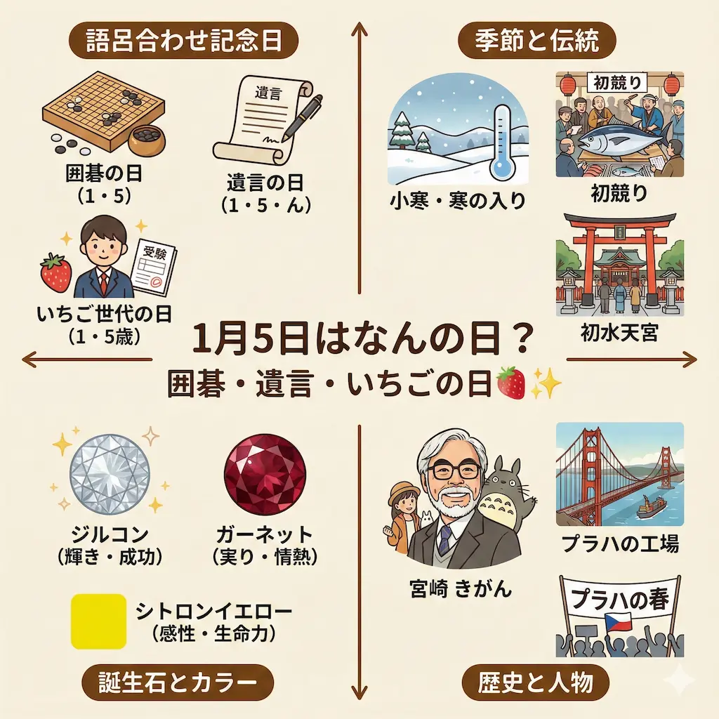 1月5日は、伝統的な遊びである囲碁から、将来を見据えた遺言、そして若者を応援するいちご世代の日まで、多様な願いが込められた日です。小寒という季節の節目を迎えながら、市場の初競りや初水天宮といった新年の活気にも溢れています。