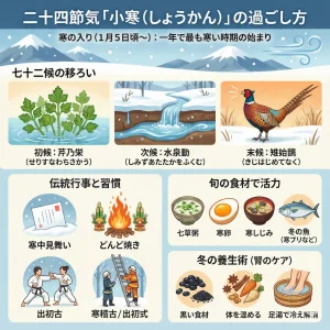 1月5日頃は、二十四節気の「小寒(しょうかん)」にあたることが多いです。「寒の入り」とも呼ばれ、これから約1ヶ月続く最も寒い期間が始まります。