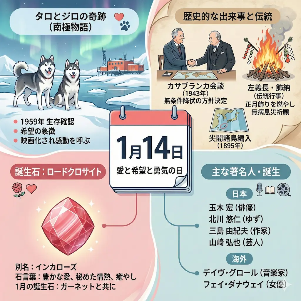 1月14日は、タロとジロの奇跡が示す「諦めない心」と、ロードクロサイトが象徴する「情熱的な愛」に満ちた一日です。歴史的な領土決定から伝統的な火祭りまで、過去と現在をつなぐ重要な節目でもあります。