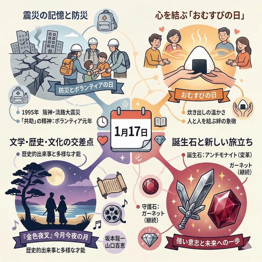 1月17日は、悲しみ、温かさ、文学的な情熱、そして新しい命の誕生が交錯する、極めて密度の高い一日です。阪神・淡路大震災の記憶は、防災への備えとおむすびに込められた「結び」の精神として、私たちの生活の中に息づいています。