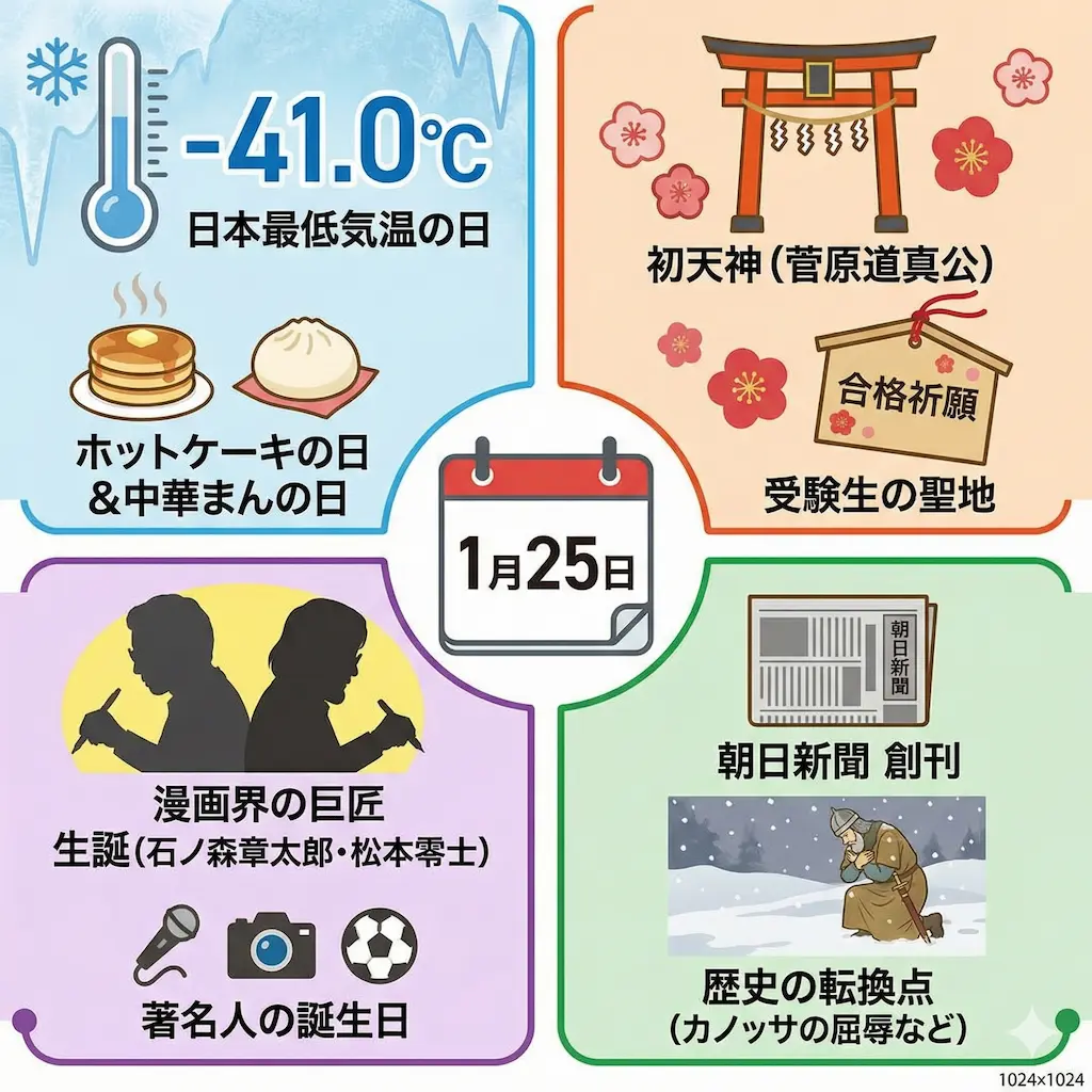 1月25日は、日本最低気温という厳しい寒さの記憶と、それを温かい食べ物で乗り越えようとする知恵が同居する日です。私が今回調べてみて一番印象に残ったのは、寒さや左遷といったネガティブな要素を、お祝いや信仰といったポジティブなエネルギーに変えている点でした🌟