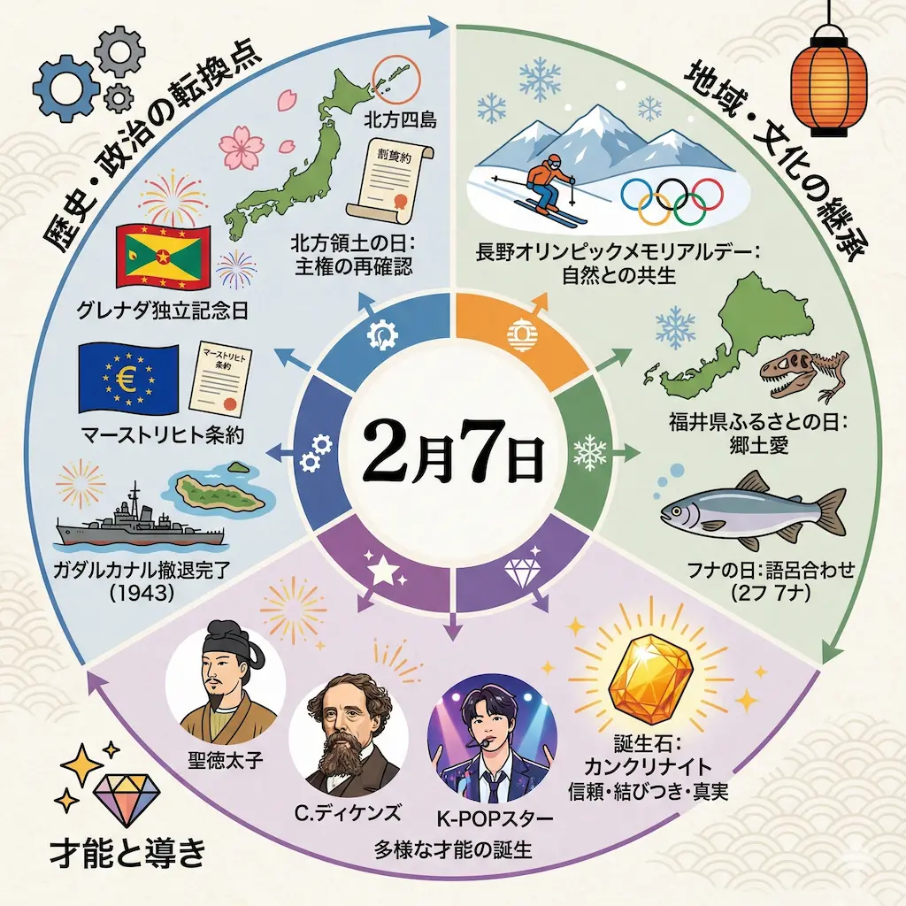 行政的な成り立ちを祝う日から、言葉遊びから生まれた楽しい記念日まで多種多様です。私たちの生活に密着した2月7日の側面を詳しく紹介します。🏮