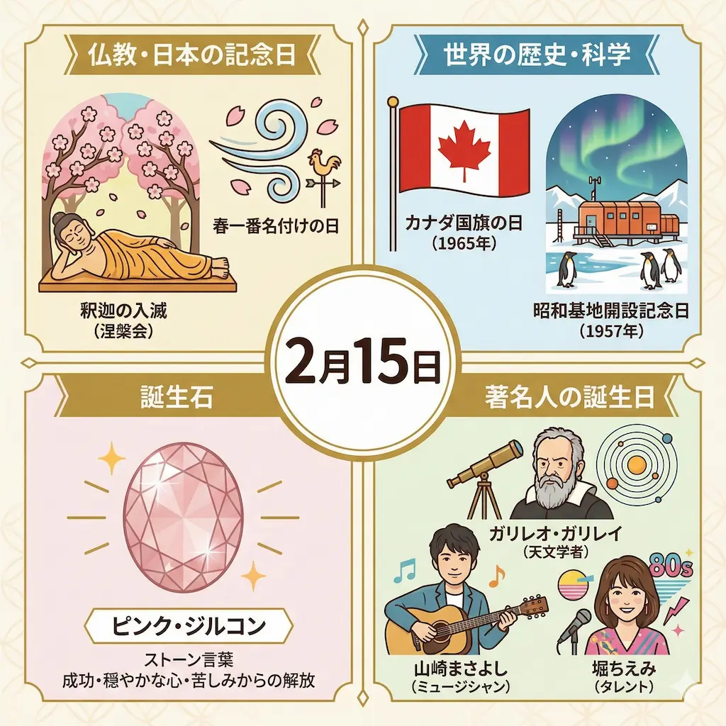2月15日は、お釈迦様の入滅という深い宗教的意味を持ちながら、春の訪れや科学の進歩を祝う日です。歴史の重みと未来への希望が共存している稀有な日付だと感じます。