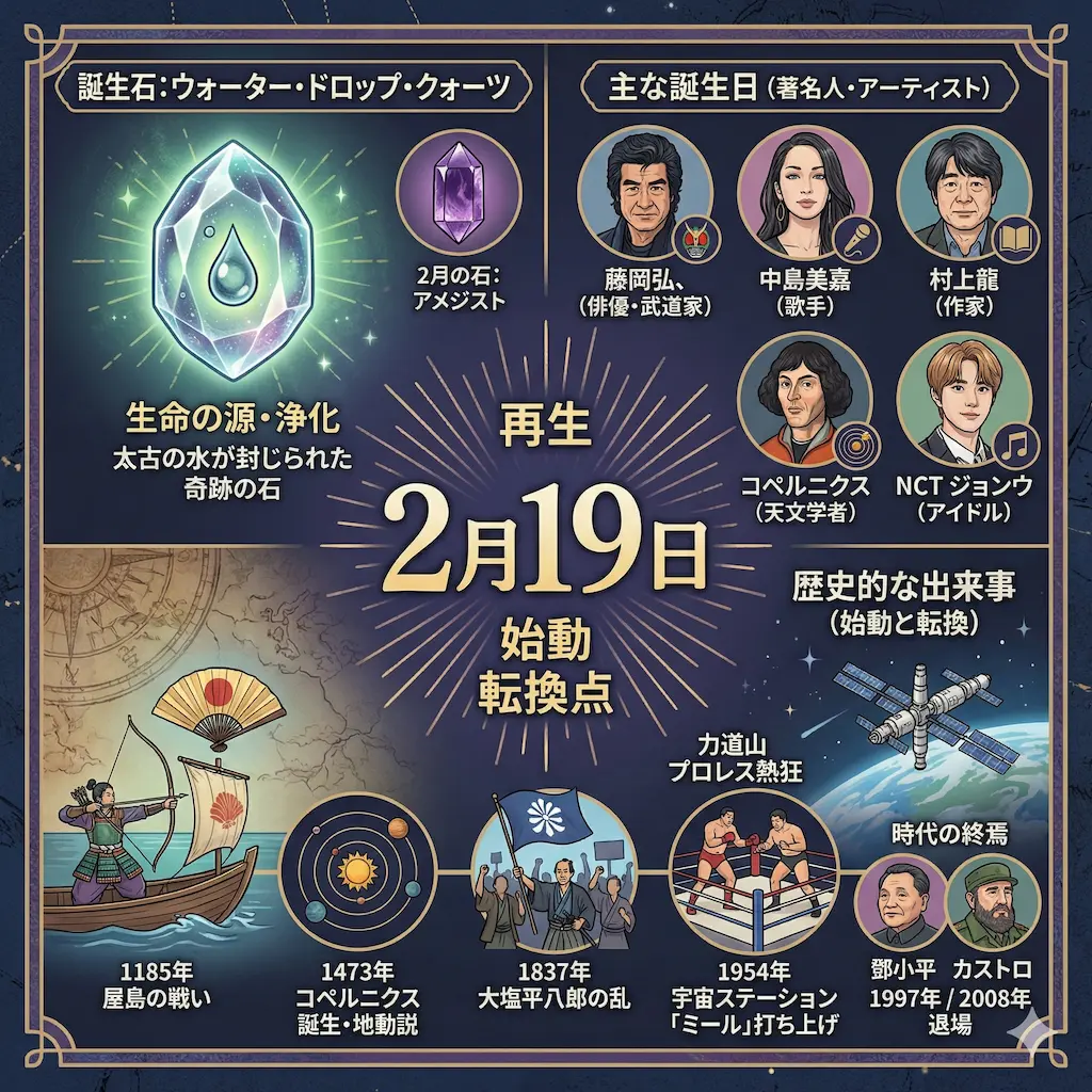 2月19日は「始動」「反乱」「終焉」という3つの顔を持つ非常にドラマチックな一日です。コペルニクスの誕生から宇宙ステーションの打ち上げまで未来を切り開く力が溢れています。