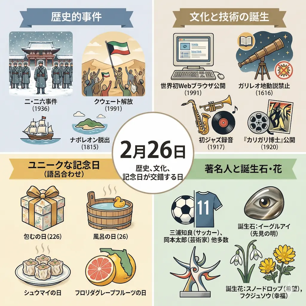 2月26日は、歴史の分岐点となる出来事が重なる特別な一日です。私はこの日が持つ重厚な歴史と、現代のユニークな記念日のギャップにいつも驚かされます。🌍