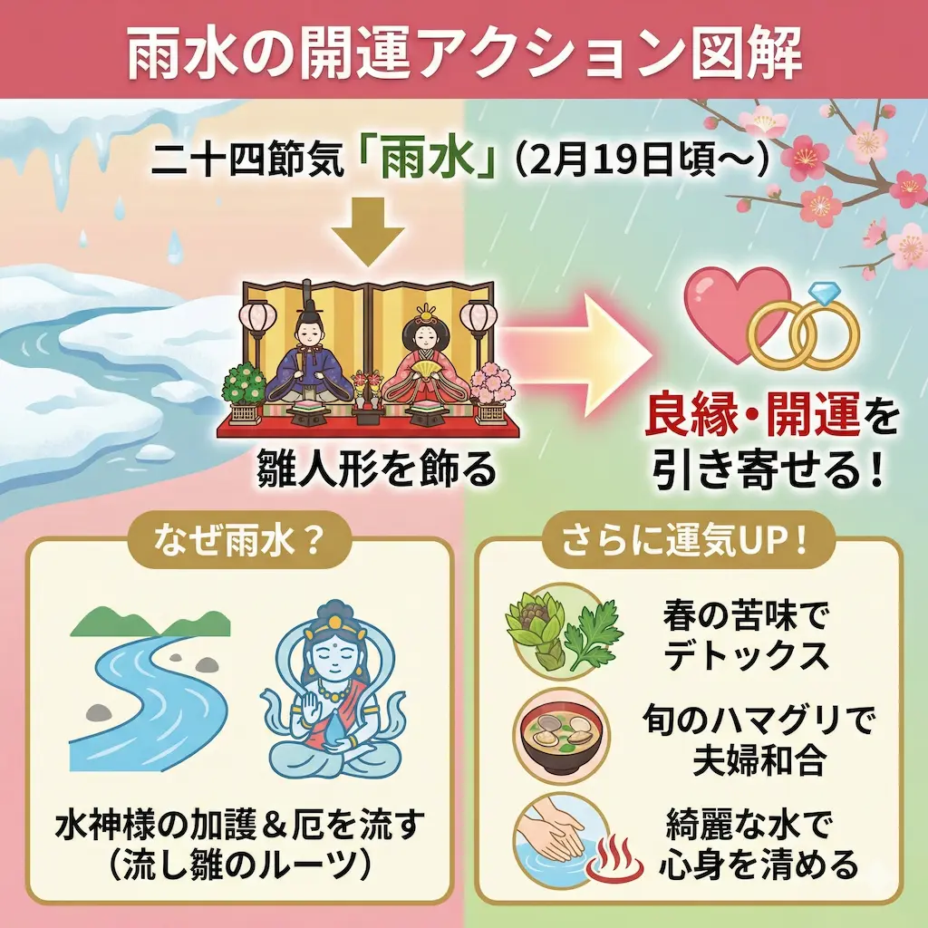 雨水は、凍てついた世界が溶け出し、新しい命が動き出す素晴らしい節気です。この時期に雛人形を飾り、旬の食材をいただくことで、あなたの運気は確実に見違えるほど良くなります。