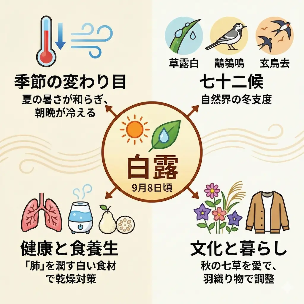 私は毎年この時期になると空気が澄み渡る感覚を肌で感じています。白露(はくろ)は草花に降りた露が白く光って見える季節を指します。🌱✨